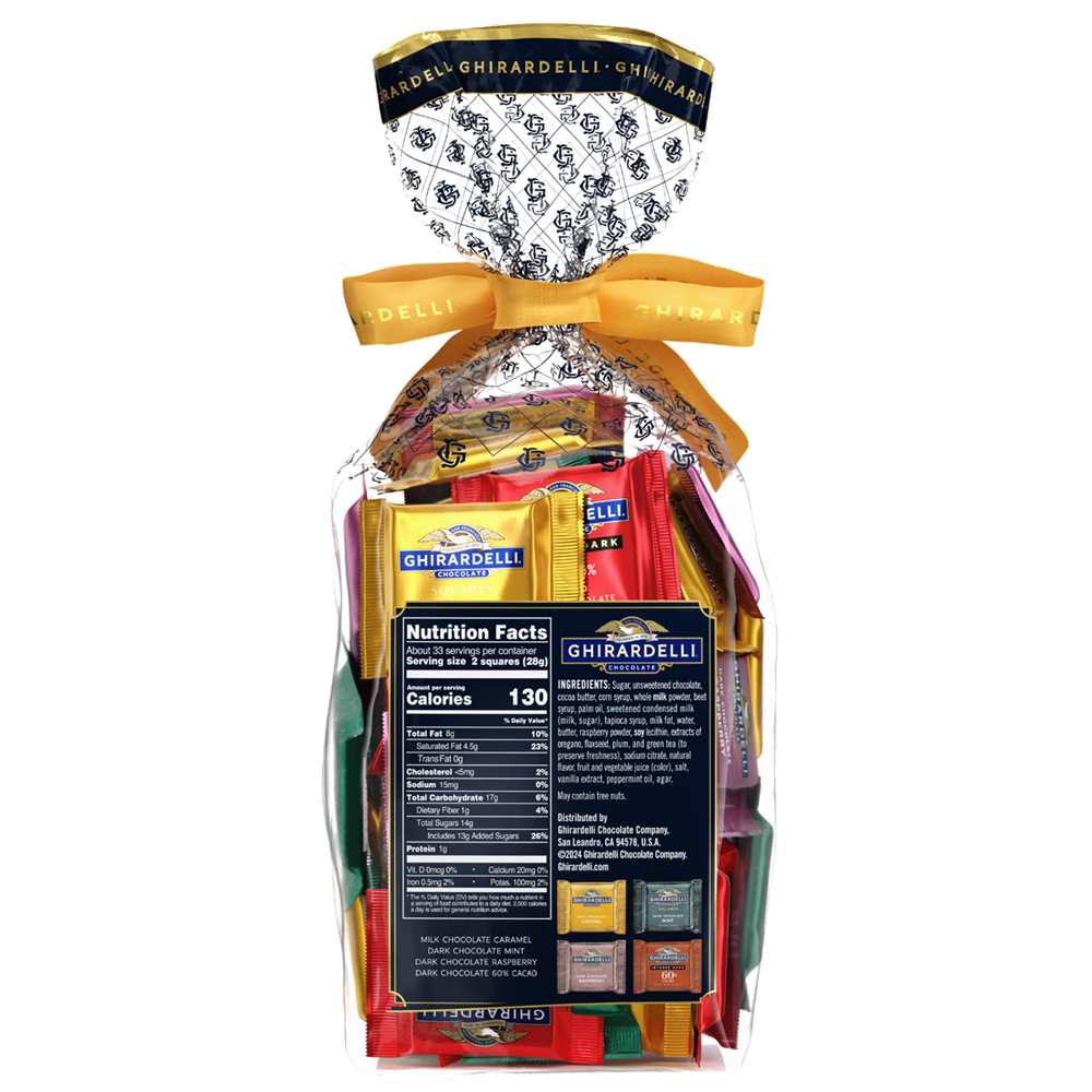 - Contains a 2lb assortment of individually wrapped SQUARES in 4 flavors: Milk Chocolate Caramel, Dark Chocolate 60% Cacao, Dark Chocolate Mint & Dark Chocolate Raspberry