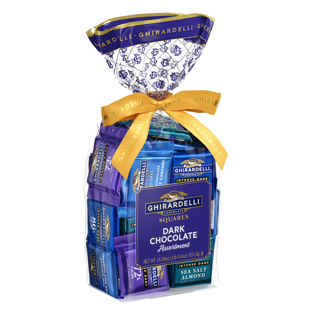 - Contains a 1lb assortment of individually wrapped SQUARES in 4 flavors: Intense Dark 72% Cacao Dark Chocolate, Intense Dark 86% Cacao Dark Chocolate, Intense Dark Sea Salt Almond Dark Chocolate & Dark Chocolate Sea Salt Caramel